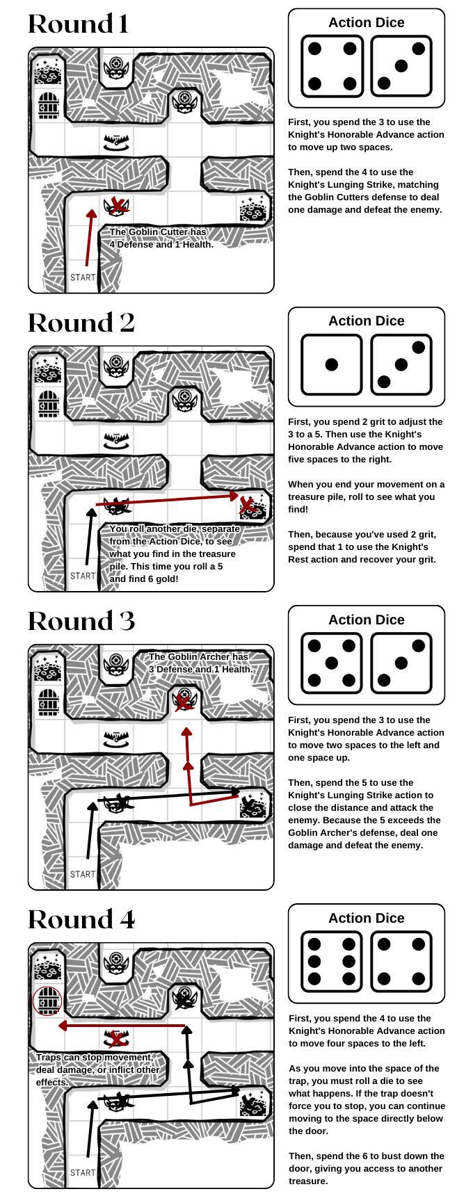 The following is an example of play using the Knight hero and the Goblin Tunnels map, both of which can be found in the first Core Set.Each round you roll two dice, called the Action Dice. Then, you "spend" the values of those dice to perform actions.