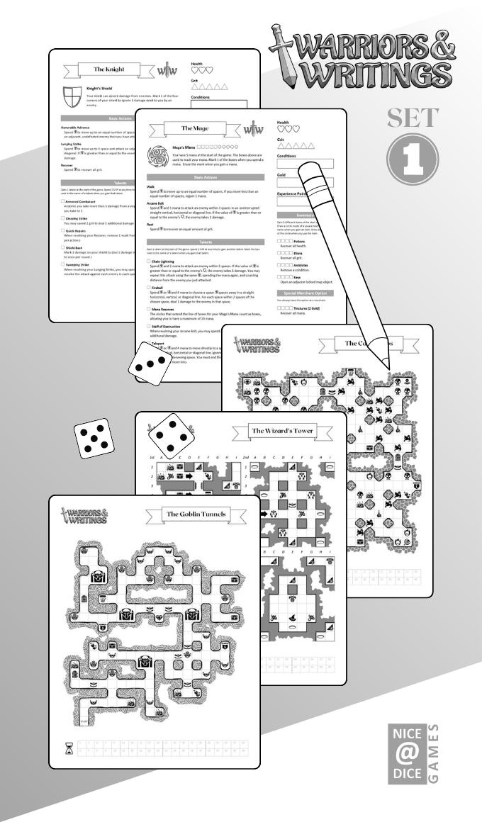 Warriors & Writings is a print & play, roll & write, fantasy dungeon crawler. It plays in about 30 minutes and accommodates 2 - 4 players in competitive play. It can also be played solo by a solitary adventurer. This game is recommended for players 10-years-old and up.